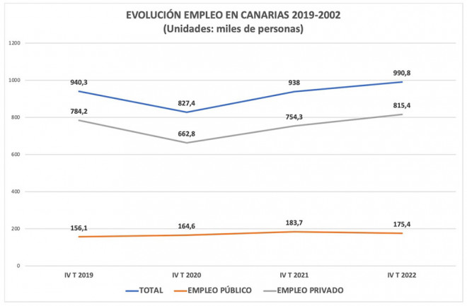 En datos, entre los años 2019 y 2022 (realizando la comparativa de la EPA de los cuartos trimestres de ambos) hay en la Comunidad Canaria 50.500 ocupados más. De los que 31.200 (61,8%) corresponden al sector privado y 19.300 al empleo público (38,2%). En total hay a final de 2022 un 17,70% de trabajadores públicos, un punto porcentual más que el dato anterior a la pandemia (16,60%).